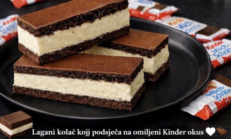 Savršeno mekane čokoladne kore i lagana mliječna krema čine ovaj kolač neodoljivim na prvi zalogaj. Jednostavan je za pripremu, izgleda kao iz slastičarne, a okus podsjeća na svima omiljene Kinder šnite.
