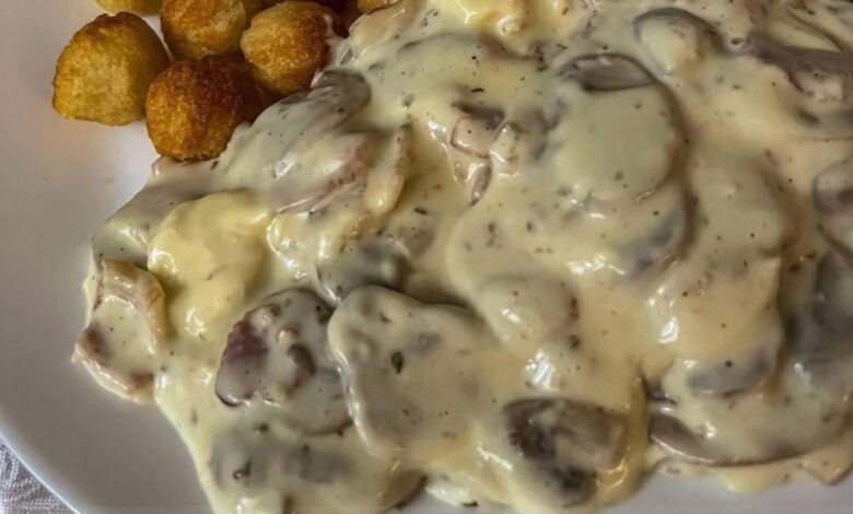 Dodajte ovu smesu u tiganj sa pečurkama i slaninom. Kuvajte na srednjoj vatri dok se sos ne zgusne – oko 5 minuta. Ovaj sos je bogat, kremast, ali zahvaljujući slanini i začinima – pun karaktera i dubine ukusa.