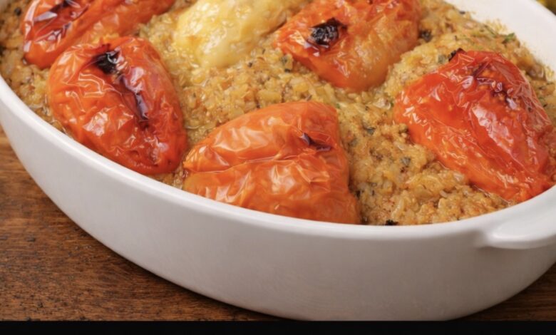 7. Ostatak smjese rasporedite u posudu za pečenje, pa preko složite punjene paprike.