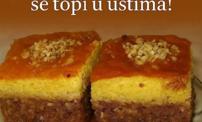 Skuvati sirup od šećera, vode i limuna sečenog na kolutove (ne dugo, nekoliko minuta). Vrućim sirupom preliti vruć kolač. Posuti mlevenim orasima.